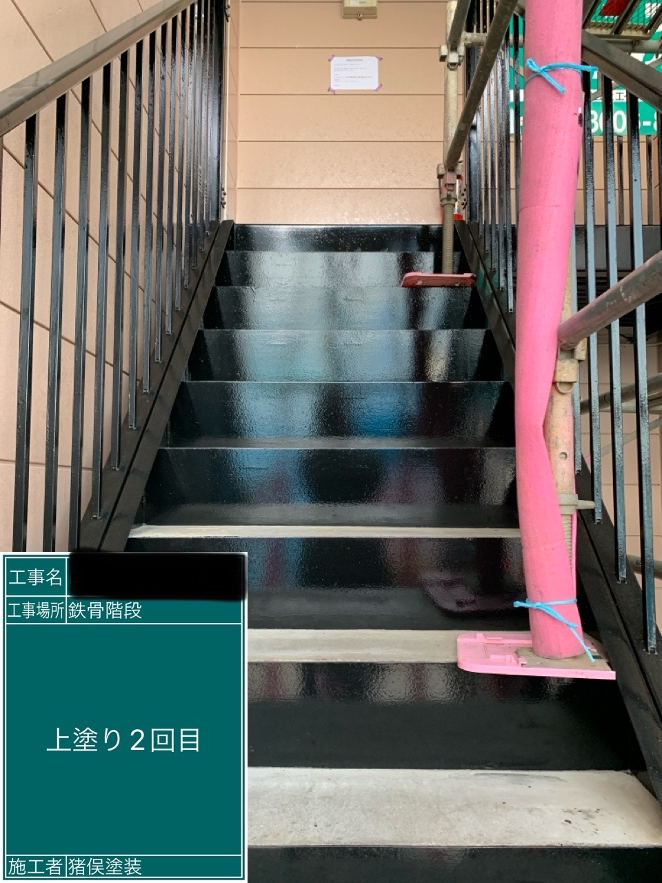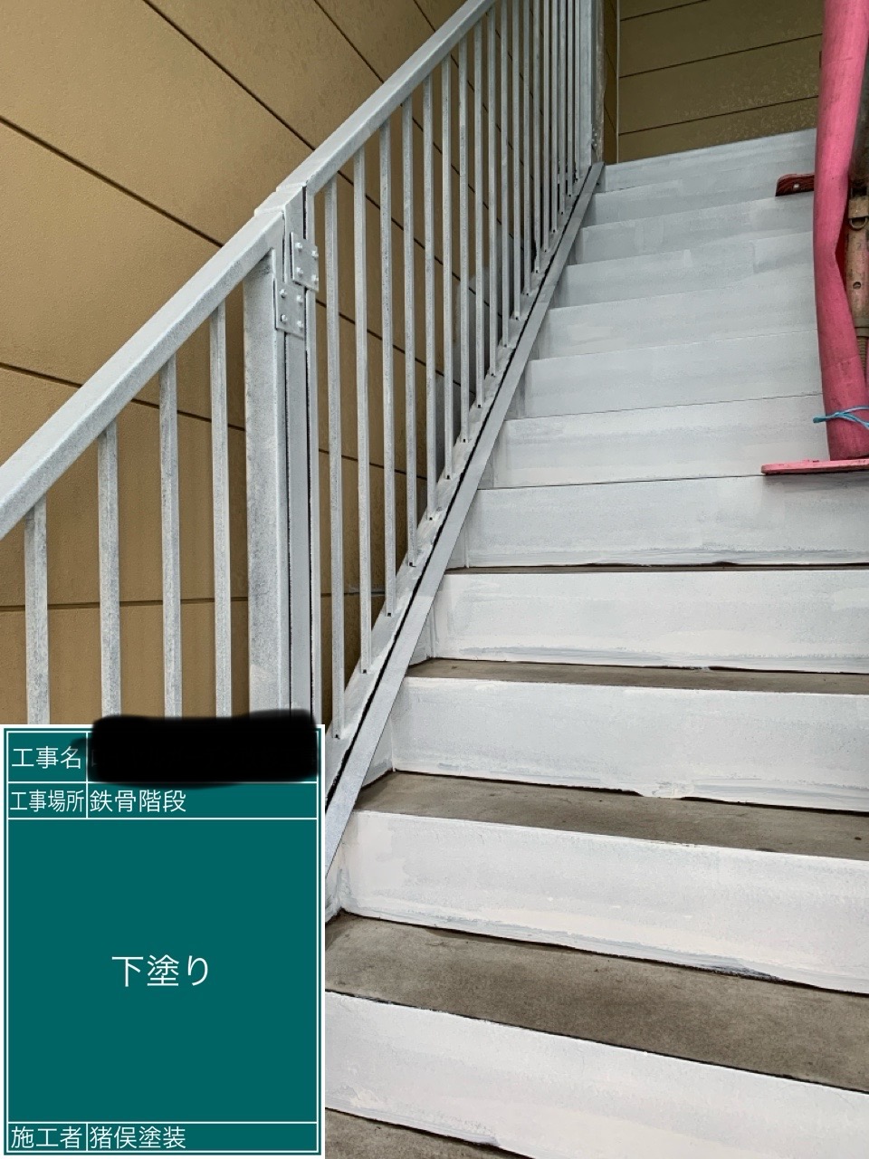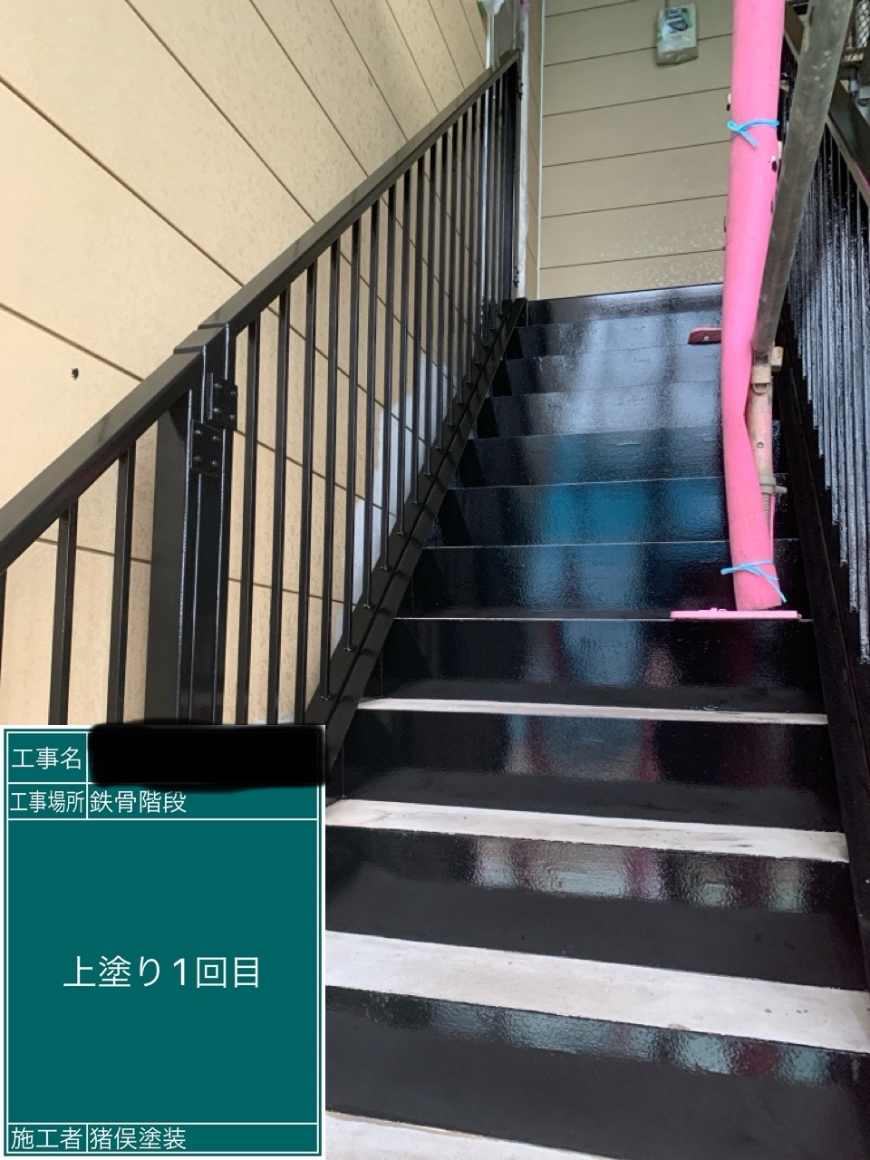 それでは、下に鉄骨階段の施工前、下塗り、上塗り1回目、上塗り2回目の工程写真を載せますので参考にして頂きたいです。