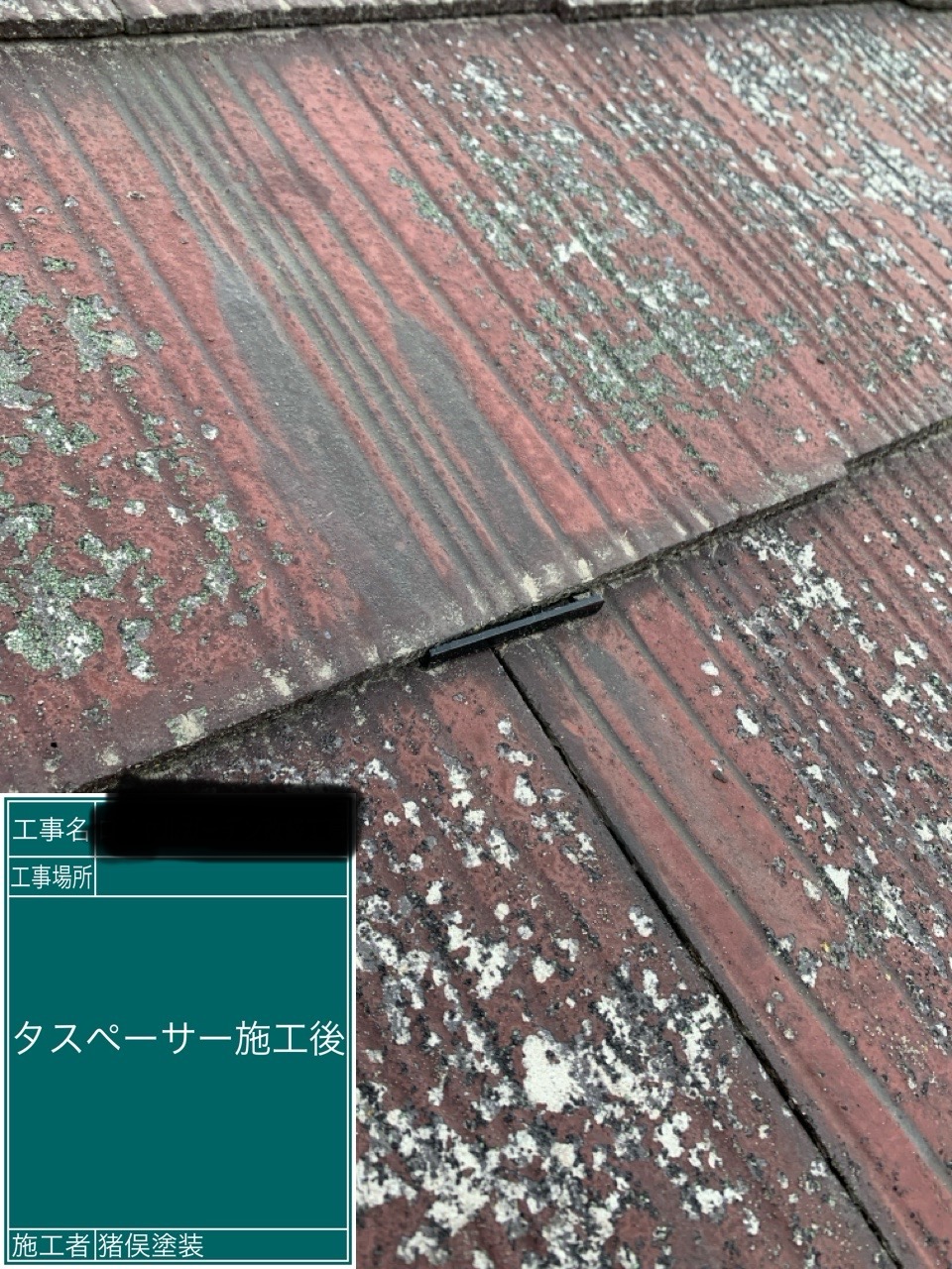 工程は高圧洗浄を行い、縁切りのタスペーサー(工程写真の上にタスペーサーの説明を記入してあります。)、次に下塗りの遮熱用プライマーを塗装後、上塗りの遮熱塗料を2回塗装します。