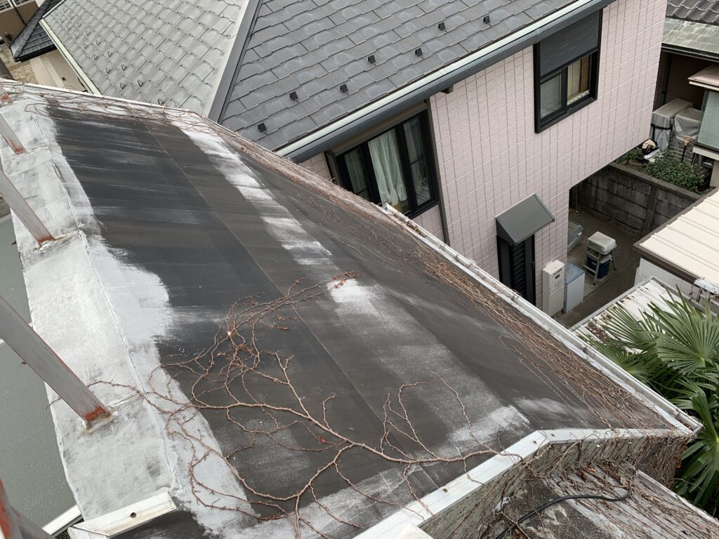 所沢市のお客様からご依頼を受け、コンクリートの外壁と屋根塗装、防水工事を行いました。今回は屋根編です。地面から壁、屋根までツタがびっしり生えていたので、まずはツタの撤去から作業開始しました。その後に高